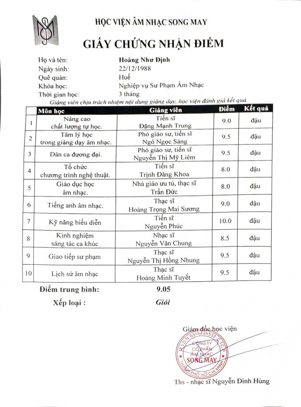 • Hoàn thiện và tối ưu hồ sơ cá nhân, với chứng nhận đã hoàn thành nghiệp vụ sư phạm âm nhạc tại học viện âm nhạc Song May.